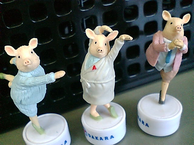 私の机の上で踊っている “ピグリン” サントリー DAKARA についているフィギュアですが ちゃんと“ピグリン・ブランド”というお名前があります。 「ピーターラビットの絵本」と作者は同じです。 ま、そんなコトはどうだってよいですが(^_^;) 毎日彼らを眺めながら うんうん。ガンバレヨッ! ・・って、つぶやいてます(笑)